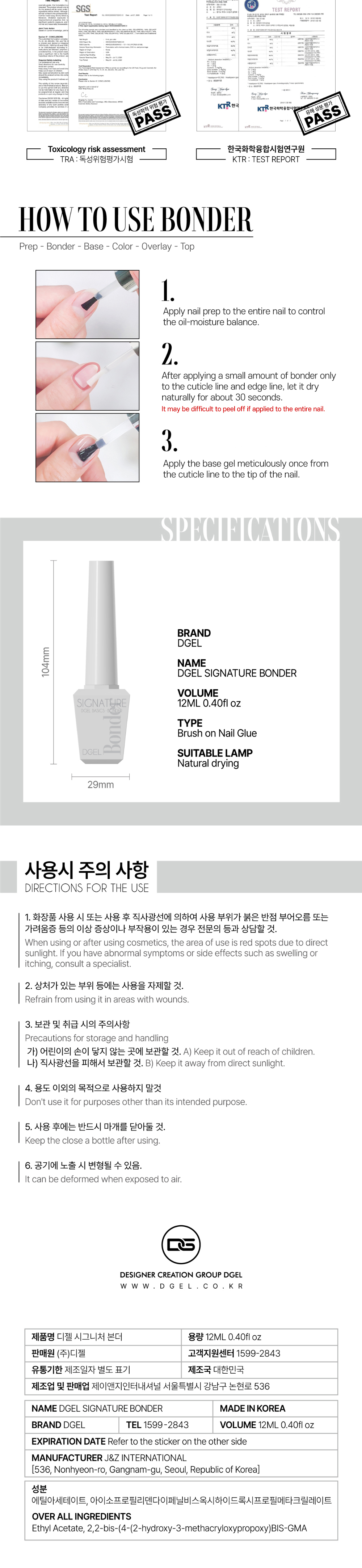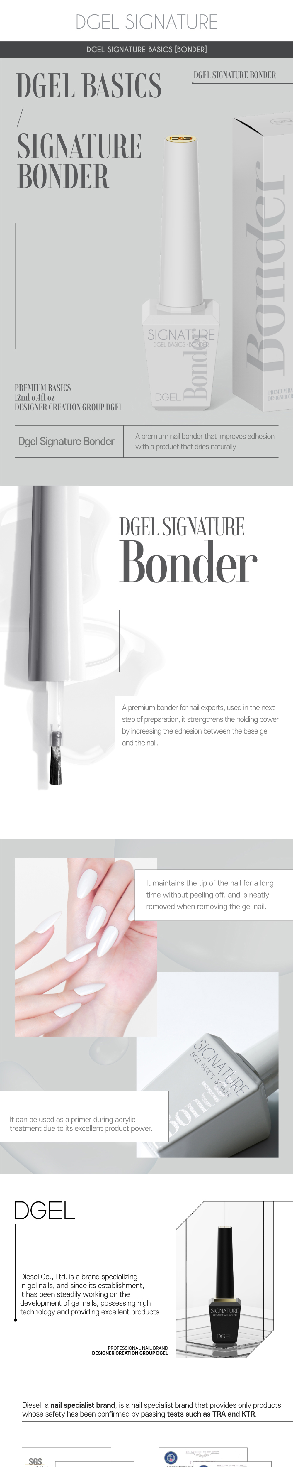Trên thị trường có nhiều loại sơn liên kết, nhiều loại bonder và cũng xuất xứ nhiều nơi nhưng DGEL SIGNATURE BONDER dòng sản phẩm cao cấp số 1 Hàn Quốc luôn được các chuyên gia làm móng trên toàn thế giới tin dùng bởi độ bền theo thời gian và giá cả hợp lý. Ưu điểm DGEL Ultra Bonder là làm tăng độ bền của móng sau khi sấy khô, điều này làm tăng tuổi thọ của các sản phẩm bám dính trên móng. Dòng sản phẩm DGEL SIGNATURE BONDER với chức năng siêu liên kết giúp giữ màu sơn móng của bạn lâu hơn, tăng độ bám dính và cam kết không bong tróc đến đầu móng tay. Dòng sơn an toàn, không mùi và hương liệu gây khó chịu trong quá trình sử dụng, đặc biệt không làm hỏng hoặc gây kích ứng cho móng.