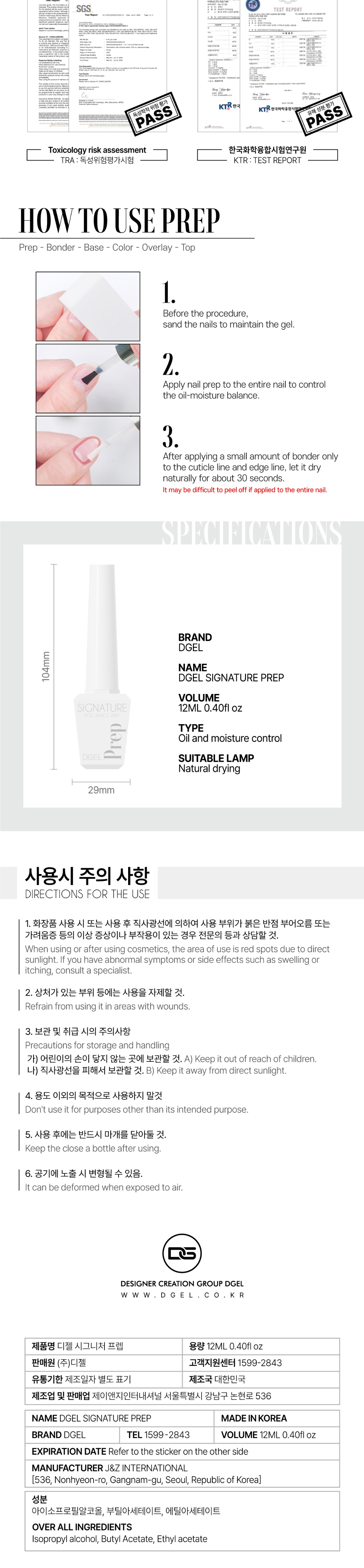“Nail prep nên được áp dụng trước khi thêm bất cứ thì gì trên móng tay” – Nail prep đóng vai trò như hàng phòng thủ đầu tiên chống lại vấn đề bong tróc sản phẩm. Nó hỗ trợ thay đổi bề mặt móng, làm móng dễ tiếp nhận các hợp chất tiếp theo. Nail prep loại bỏ dầu, hơi ẩm, nước, mảnh vụn hoặc bất kì tác nhân nào ngăn chặn sự hoạt động của lớp phủ primer (sơn lót) và bonder (chất kết dính). Đây là sản phẩm được các thợ nail/ nail salon sử dụng thường xuyên cho tất cả các dịch vụ làm móng khác. DGEL SIGNATURE PREP là một sản phẩm an toàn từ thương hiệu DGEL và được xác minh chỉ sử dụng các nguyên liệu đã vượt qua bài kiểm tra nghiêm ngặt TRA
